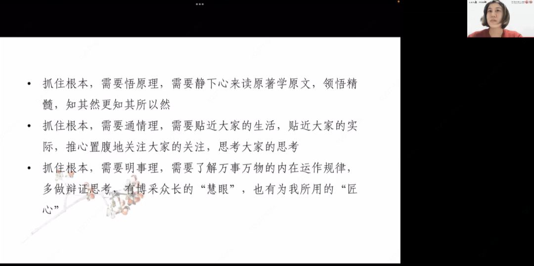 之后张晓华师姐结合自己在学生工作中参与理论研究工作和在人民论坛、新华网等平台发表文章的写作经验,为同学们就理论学习和文章写作的主题进行了分享。她认为写出好文章的基础是构建好底层的逻辑体系,而底层逻辑体系的构建来自于扎实的理论学习。理论学习要关注最新的表述、最原真的文本和最深刻的逻辑,同时要带着问题和思考多读有高度有深度的理论文章,形成较好的阅读品味。
