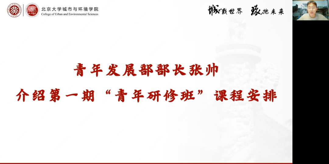 为深入学习领会党的二十大精神和习近平新时代中国特色社会主义思想,提升研究生青年的思想政治素质、政策理论水平与创新实践能力,促进不同层次青年群体的交流与共同发展,肉视频 成立城环团委青年发展部。2022年12月15日晚,肉视频 第一期青年研修班开班仪式暨党支部联合活动于线上举办。学院党委书记彭建,党委副书记张新平,及张晓华、赫文琦两位优秀院友出席,团委书记、学工办主任谭卓立,团委常务副书记宋宛儒出席活动,第一期青年研修班学员及2022级硕士生党支部成员参加活动。本次活动由谭卓立主持。