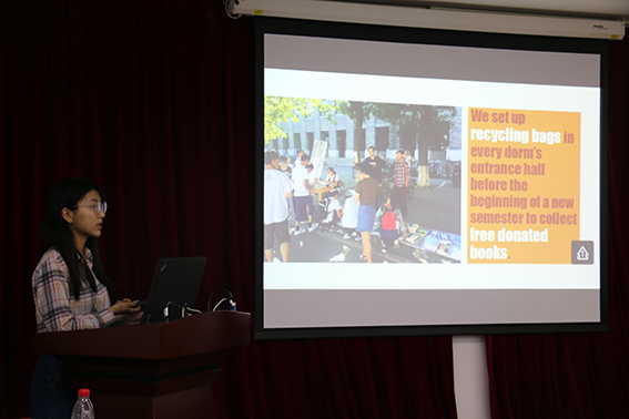 随后,学院学生代表张志皓同学(中国大学生环境教育基地志愿者)介绍了“林歌”项目在校园废纸、军训衣物回收等方面所做的主要工作;童培峰同学(本科生科研学生代表)介绍了学院在本科生科研教学工作的培养项目和学术研究成果。
