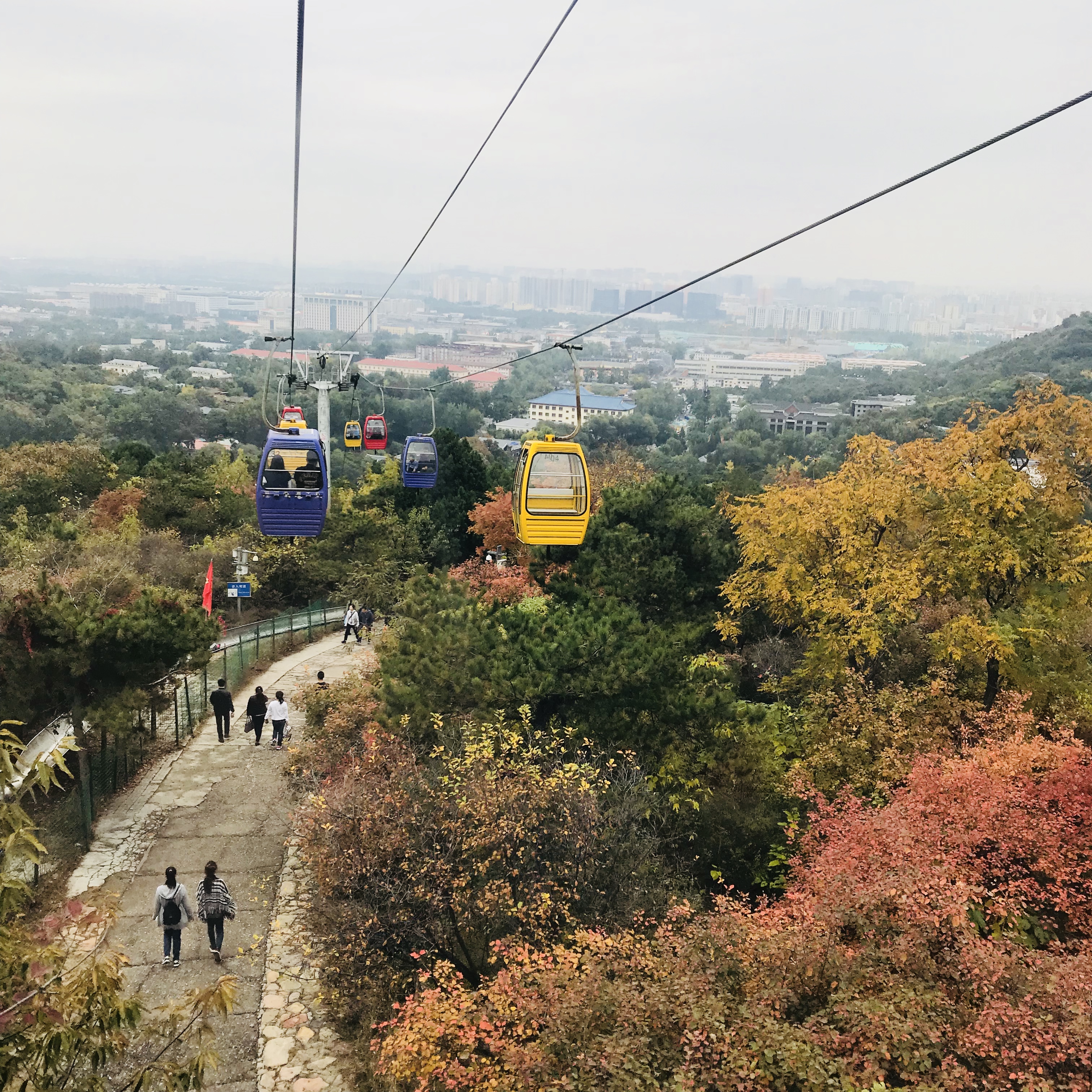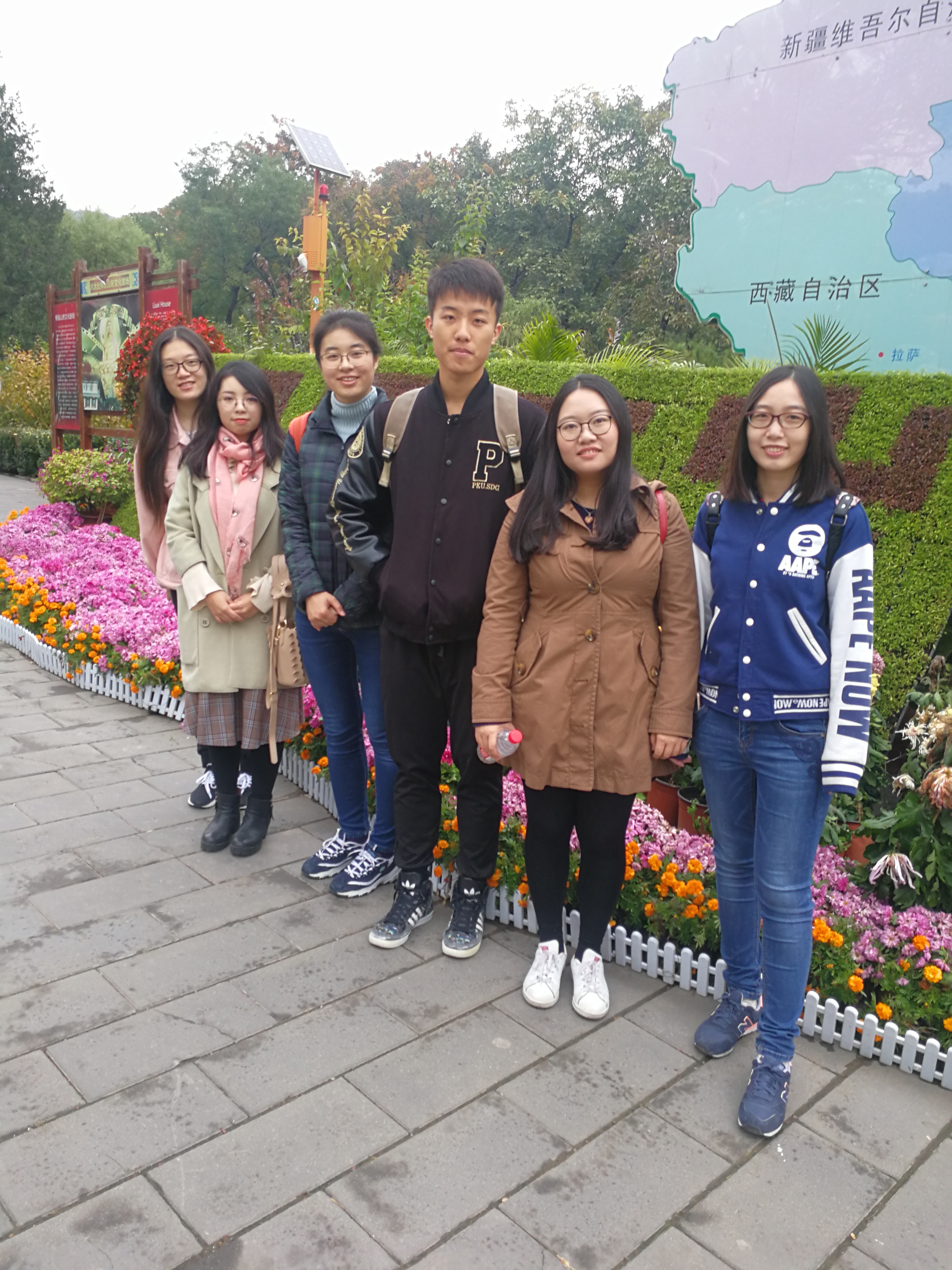 上午10时,同学们来到西山南麓八大处公园,集体进入园内参观著名的八处古刹和十二景观。甫一进园,远处虎头山上占地5000多平方米的大地艺术“祖国好”巨幅长卷就映入同学们眼帘,这是为了迎接国庆,公园200多名职工历时一周缝制的巨幅布雕。尽管国庆已过,同学们依然感受到对祖国华诞的美好祝福,一时间心情激荡不已。此时的西山尚未红遍,但黄色的银杏、红色的枫叶夹杂在绿意葱葱的山林间,煞是好看,不由得让同学们为祖国的大好河山折腰。十多万株黄栌、火炬、元宝枫等各种红叶树种,秋霜过后,满山流丹,处处皆景。同学们赞叹不已,纷纷举起手中的相机,记录下这美好的一幕。
