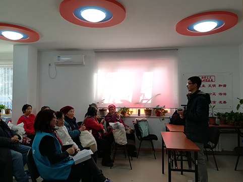 第二部分是由苏比同学介绍有关塑料的常识,第三部分是由张斯琦同学介绍点外卖、寄快递对环境造成的负面影响。两位同学的讲解通俗易懂又不失诙谐幽默,老人们也不时发表自己的看法。老人们表示,她们深知废弃塑料、外卖快递包装的难以降解与巨大危害,所以很少点外卖或收发快递,即使有少量的废弃物,也会扔进不可回收类的垃圾桶内由社区统一处理。她们还表达了对当代一些大学生由于懒惰而天天点外卖、网购的现状的不满,希望林歌计划下一步能在此方面做出努力。