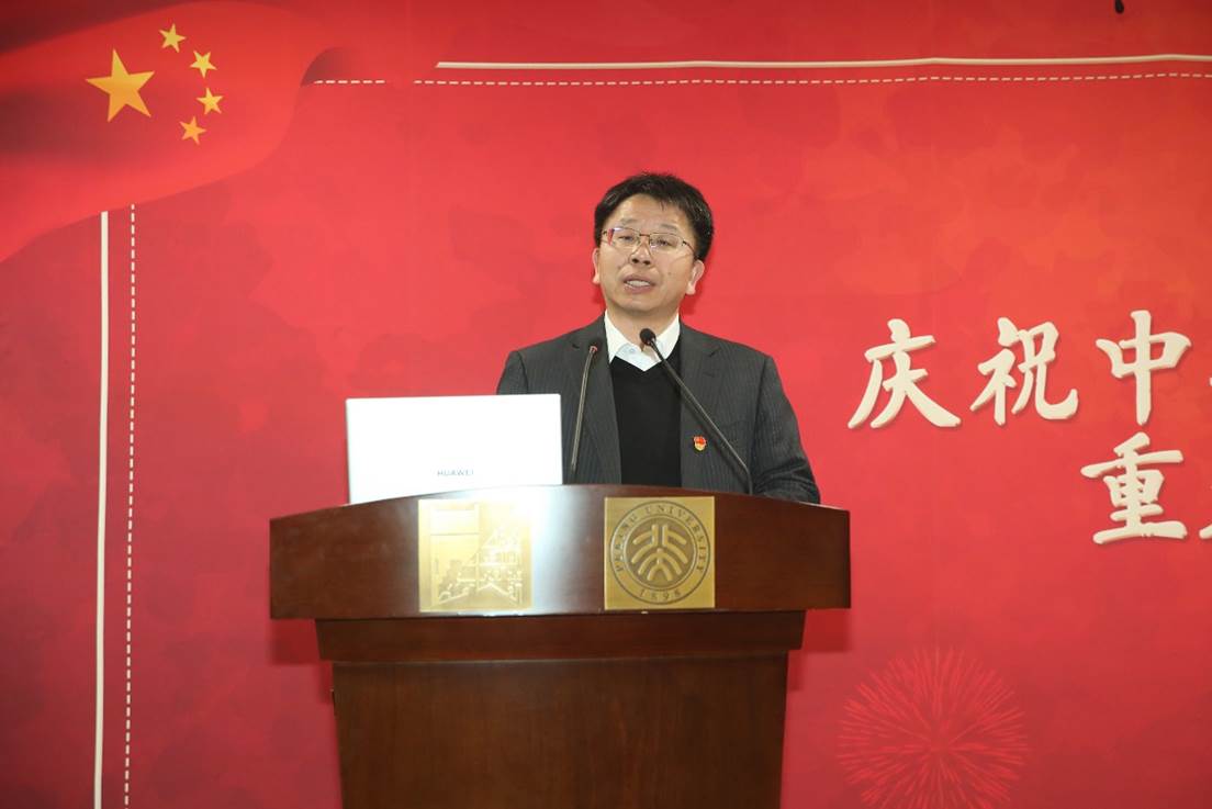 随后,刘耕年上台致辞,他首先对参与重大活动的师生表示了祝贺与感谢,赞扬了师生在活动中的全情投入与对祖国深切的爱。他指出,当我们和国家、和民族能够如此紧密地联系起来时,当我们能够为祖国献上自己的一份力、献上自己的一颗心时,我们就是伟大的。他希望全体师生能够不忘初心、牢记使命,始终铭记北大的光荣爱国传统,将个人的发展与国家、民族的命运紧密相连,在新时代,新征程中奋勇追梦。