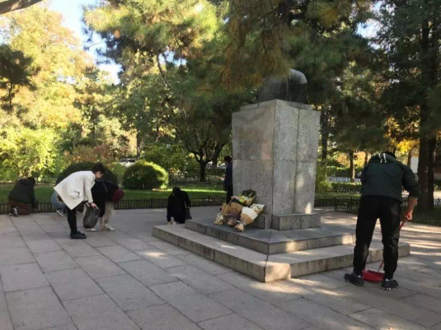 在党支书安洁的讲解下,支部同学回顾了革命先驱们的人生历程,学习了李大钊同志为革命奋斗一生的英勇事迹,领会到革命先烈为革命的忘我付出,感慨于他们为人民幸福生活不懈努力的英雄气概。此后,同学们身体力行,将感触、感动化为劳动,细致清扫地面、整理周边环境,还革命烈士纪念碑和李大钊先生铜像光洁如新。