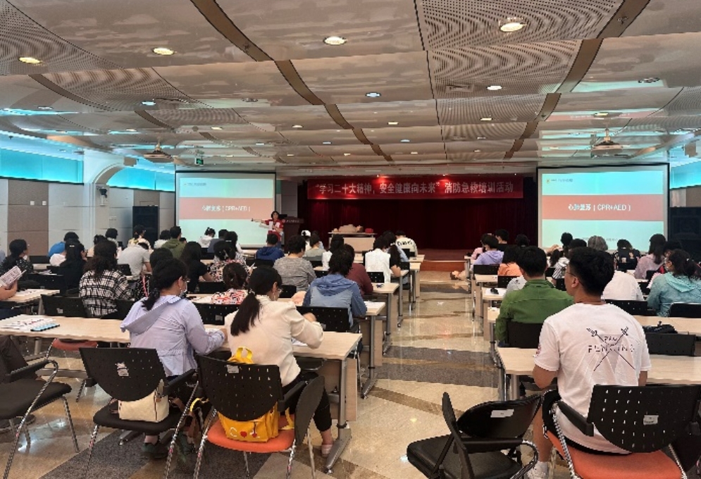 培训采用“理论+实操”的方式,首先由专业的医护人员介绍了心搏骤停的识别、心肺复苏的操作、AED的正确使用等。并利用模拟假人就心肺复苏操作的流程和AED自动体外除颤仪操作的各个环节,现场进行了详细地演示。