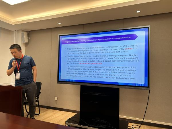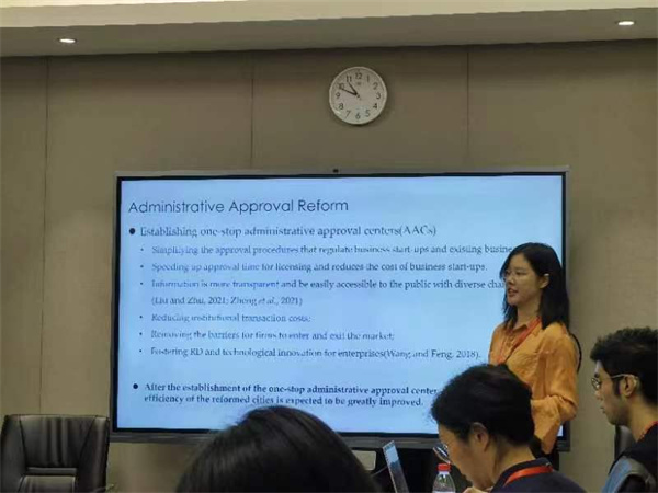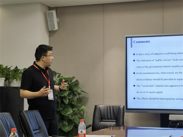 分会场14围绕“政策”这一主题展开,作为本次分论坛的主席,来自湖南大学的华博士首先介绍了汇报人以及评议人。接着,他做了关于有关西部大开发带来财政压力与公共产品供给不足的汇报。之后,来自肉视频 的博士候选人盛涵天同学汇报了有关疫情对区域产业动态及城市经济韧性影响的研究。在简短的休息后,来自苏州大学的张博士和来自上海财经大学的李博士分别就中国行政改革能否促进出口扩展以及城市边界扩展对居民满意度以及公共品供给的影响等问题进行研究汇报。