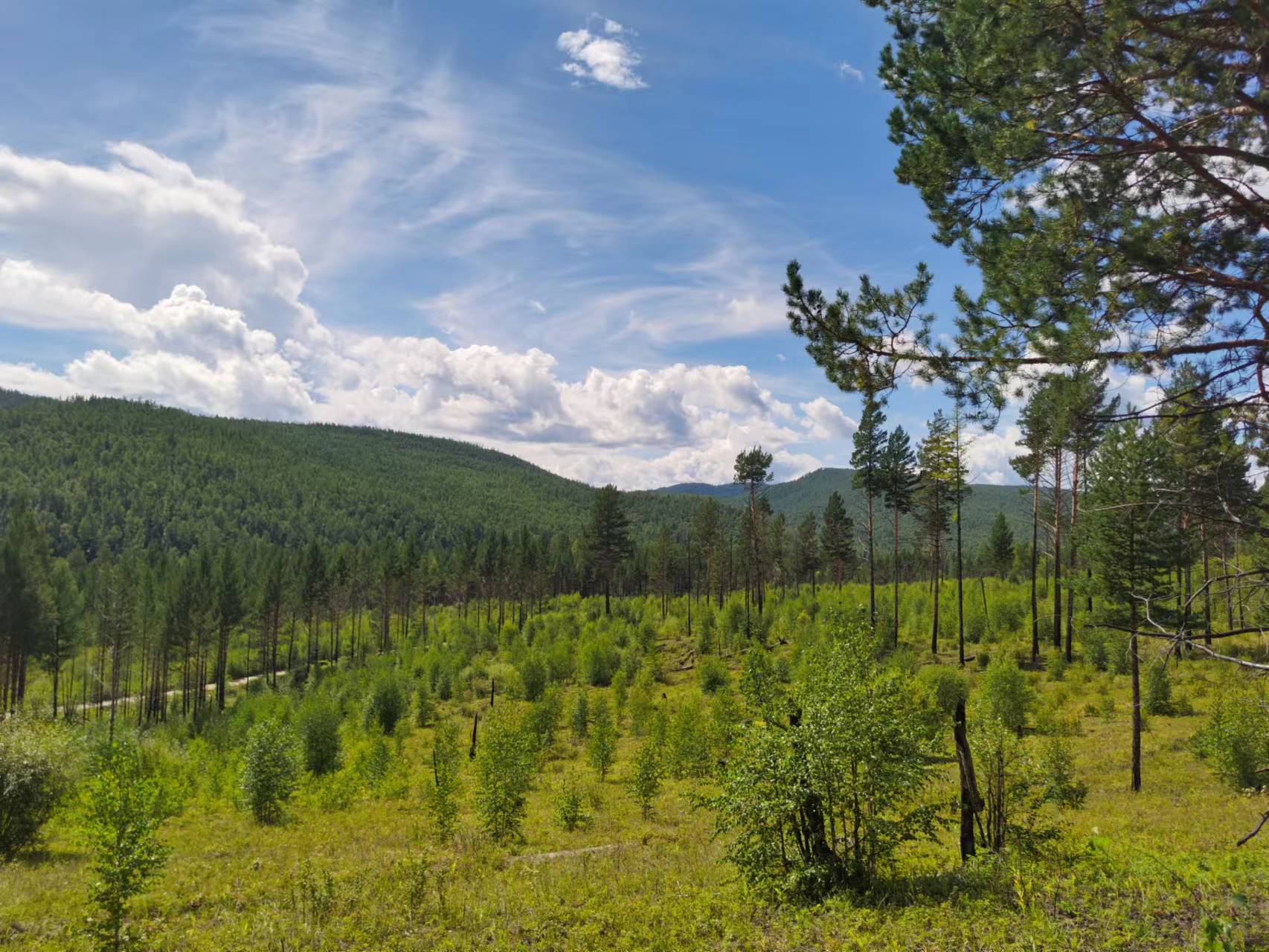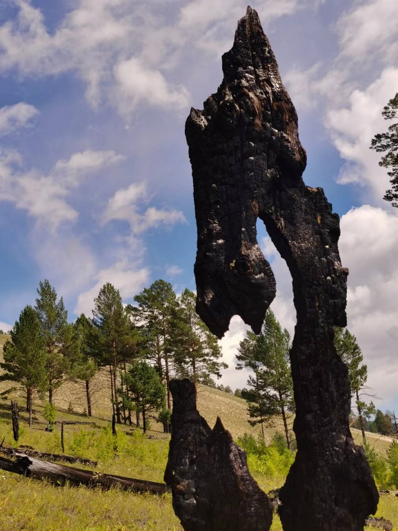 老师和同学们徒步上山,一路上,同学们观察着林下的植被,也不时邂逅可爱的动物。此处的森林林线大约处于海拔1000m,森林主要由欧洲赤松与西伯利亚落叶松构成。山杨和白桦作为先锋物种则通常在山火后长出,一路上我们看到一片片过火焚烧后的空地上生长着不同高度的树苗,从这些树木的长势可以看出过火后林地更新的时间长短。