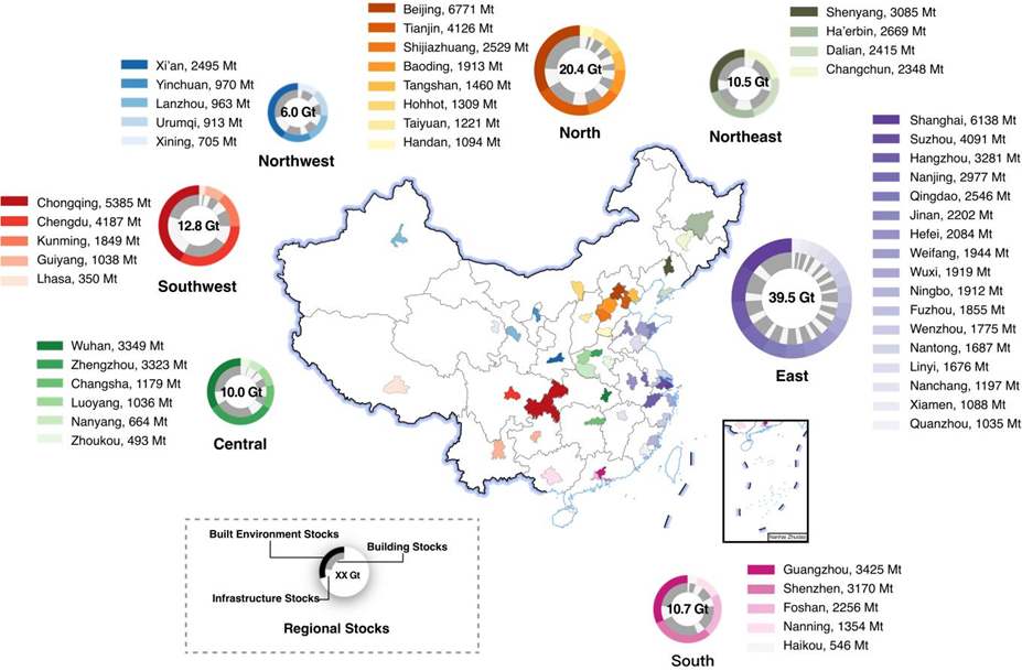 图1:中国50个城市建成环境物质存量分布。不同颜色轮状图分别代表中国7个地区(华北、东北、华东、华南、华中、西南、西北)总物质存量,轮状图内部显示了该区域各个城市的建筑和基础设施物质存量比例,其中外圈表示该地区各城市的城市建成环境总物质存量,内圈表示每个城市建筑和基础设施物质存量所占比例。