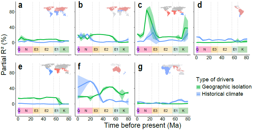 图3:历史气候(蓝色)和历史时期地理隔离程度(绿色)对植物地理区分异的相对贡献随时间的变化。