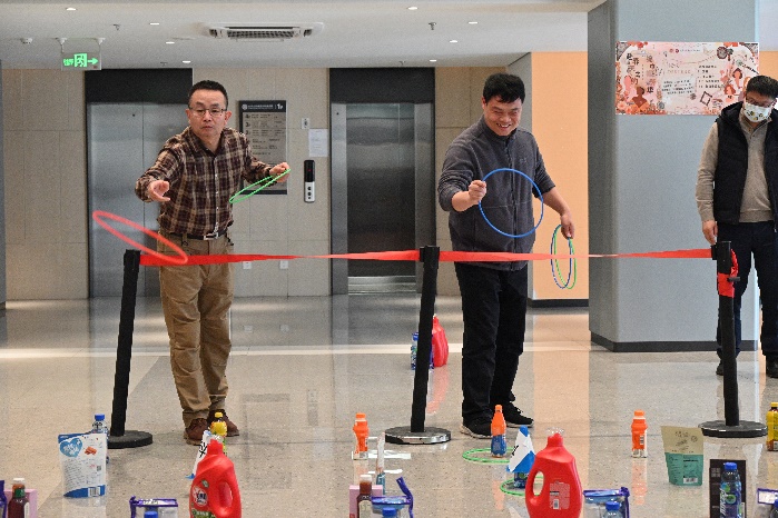 欢声笑语中,趣味套圈活动率先拉开序幕。现场布置得活泼有趣,色彩斑斓的套圈与琳琅满目的目标物品相映成趣,为整场活动注入了无尽的活力。老师们跃跃欲试,手握套圈,眼神中闪烁着期待与兴奋。每一次精准的投掷都伴随着热烈的欢呼与掌声,喜悦之情溢于言表,感染着在场的每一个人。