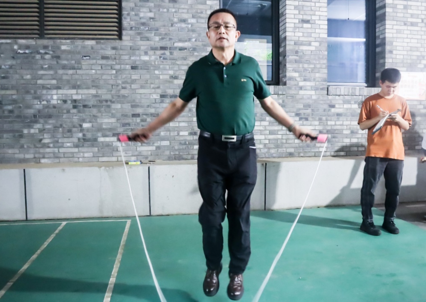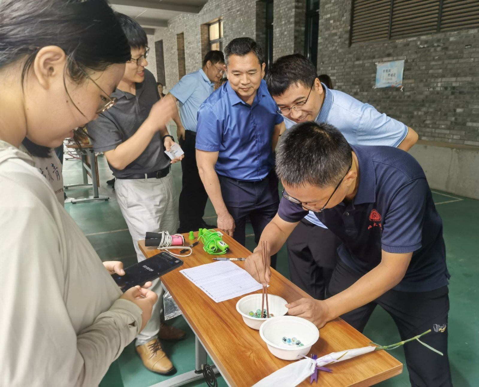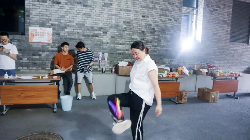 完成答题挑战后,老师们兴冲冲地来到“乘师风,勇破浪”运动挑战区域。该挑战共有五个项目:夹玻璃球挑战、毽子挑战、呼啦圈挑战、跳绳挑战、垫排球挑战。大家热情高涨地投入了各自的赛场,赛前热身,互相指导,一派活力四射的景象。彼此的眼里都闪着不服输的光,在运动中全力以赴挑战自我,无不大汗淋漓,喜笑颜开。