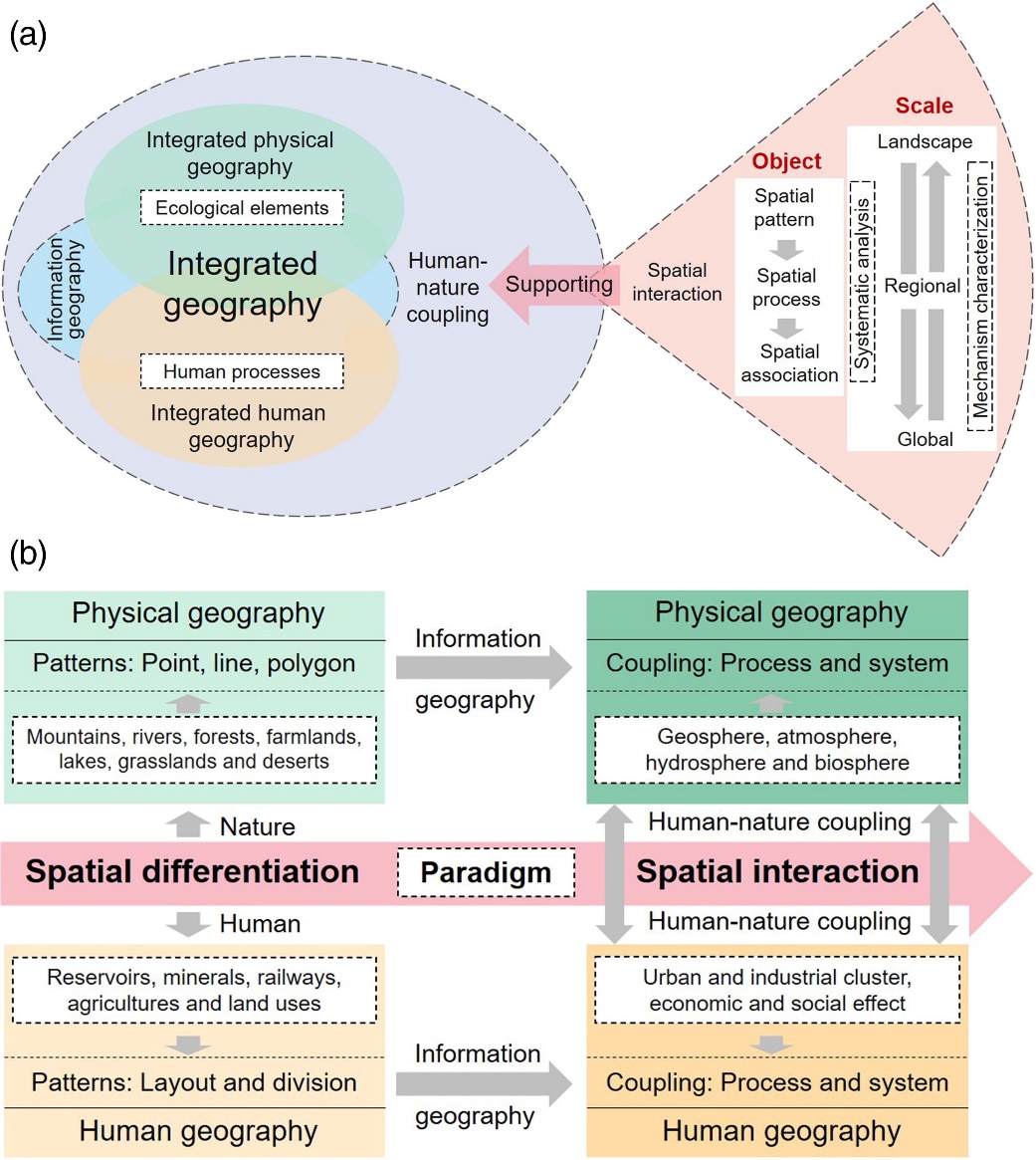 图2. (a)支撑共同体理念的综合地理学理论框架;(b)地理学研究范式从空间分异转变为空间交互。