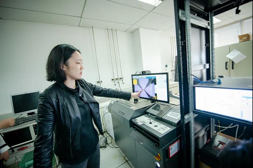 硅晶圆上蚀刻出来的触点和线路,在显微镜下如同城市的鸟瞰图。身穿皮衣和牛仔裤的黄芊芊研究员,和两位学生一起站在测试台前。如果不事先介绍,你不一定能一眼认出谁是导师。他们将晶圆上需要测试的区域停在显微镜的下方,操纵探针轻轻抵住触点,开始对晶体管进行加电测试。半导体参数分析仪的显示屏上很快出现了一条漂亮的电流曲线,说明测试对象的性能良好。